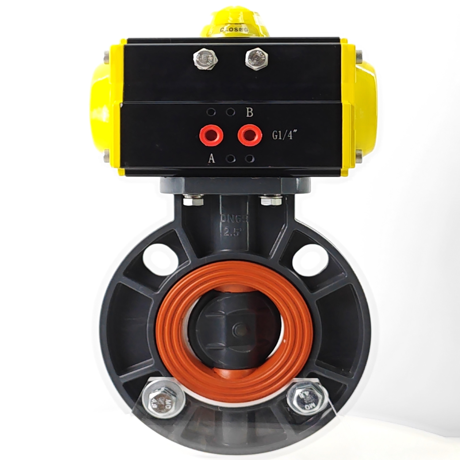 The Pneumatic UPVC Butterfly Valve is a centerline-type butterfly valve driven by a pneumatic actuator, designed specifically for corrosive media. Its core components (e.g., disc, sealing rings) can be lined with fluoroplastics (e.g., FKM, EPDM, NBR), combining UPVC’s corrosion resistance with fluoroplastics’ high-temperature tolerance. Suitable for automation control in strong acids, strong alkalis, high-purity fluids, and certain high-temperature applications, it is widely used in chemical, water treatment, food and pharmaceutical industries.